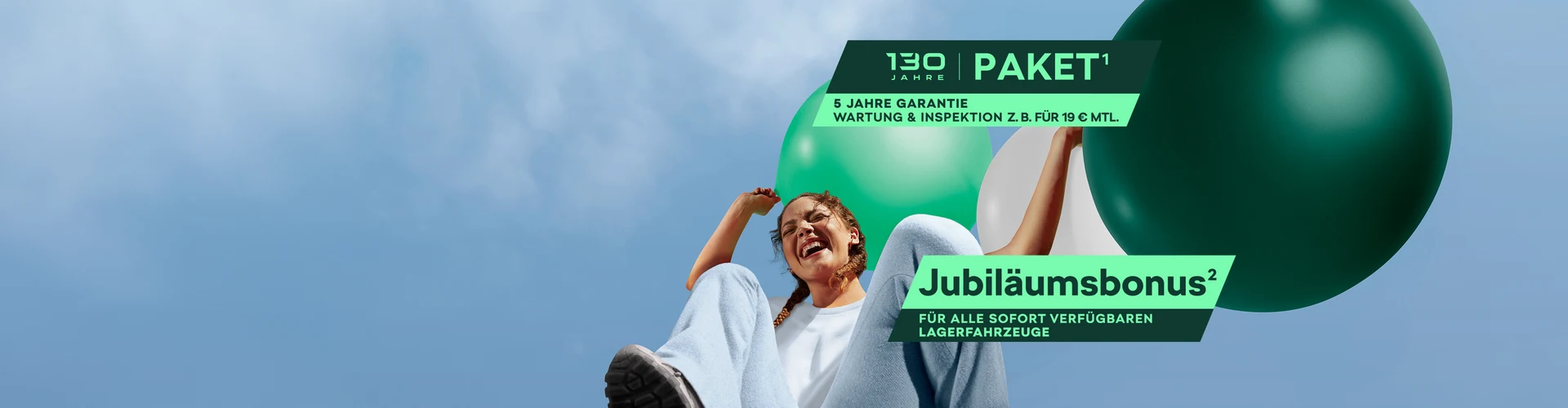 5 Der Jubiläumsbonus ist modellabhängig und besteht aus einem Herstelleranteil sowie unserem zusätzlich gewährten Händlernachlass. Gilt für Privatkunden bei Abschluss eines Kauf-, Leasing- oder Finanzierungsvertrags für sofort verfügbare Lagerfahrzeuge bis zum 30.09.2025. Gültig bei Zulassung bis zum 31.10.2025 und nur solange der Vorrat reicht. Nicht kombinierbar mit weiteren ausgewählten Sonderaktionen oder Sonderkonditionen. Der Verkaufspreis wird allein von uns festgesetzt.